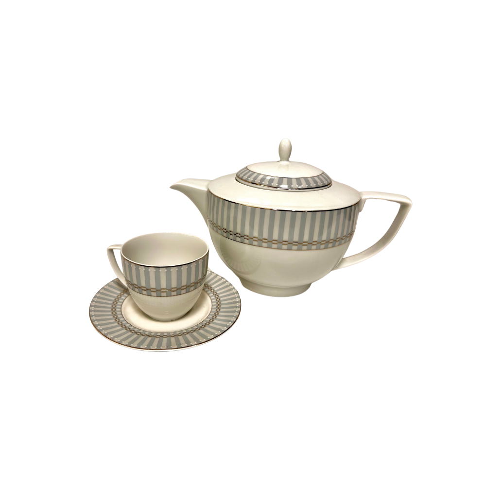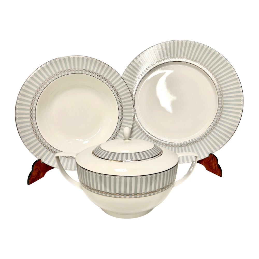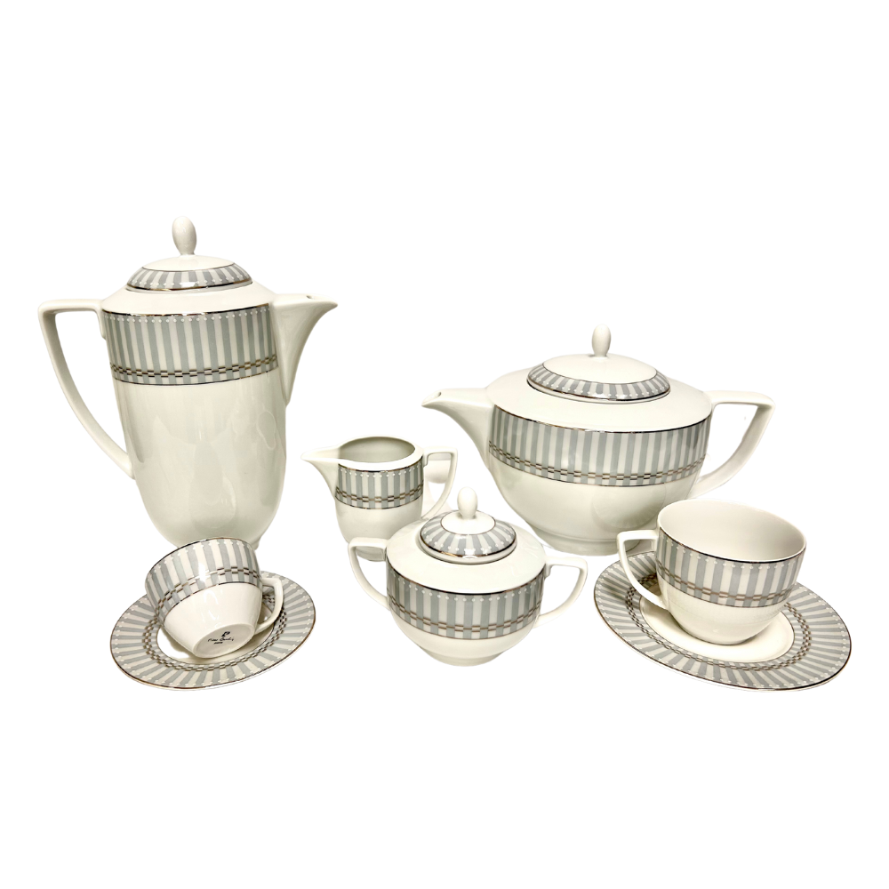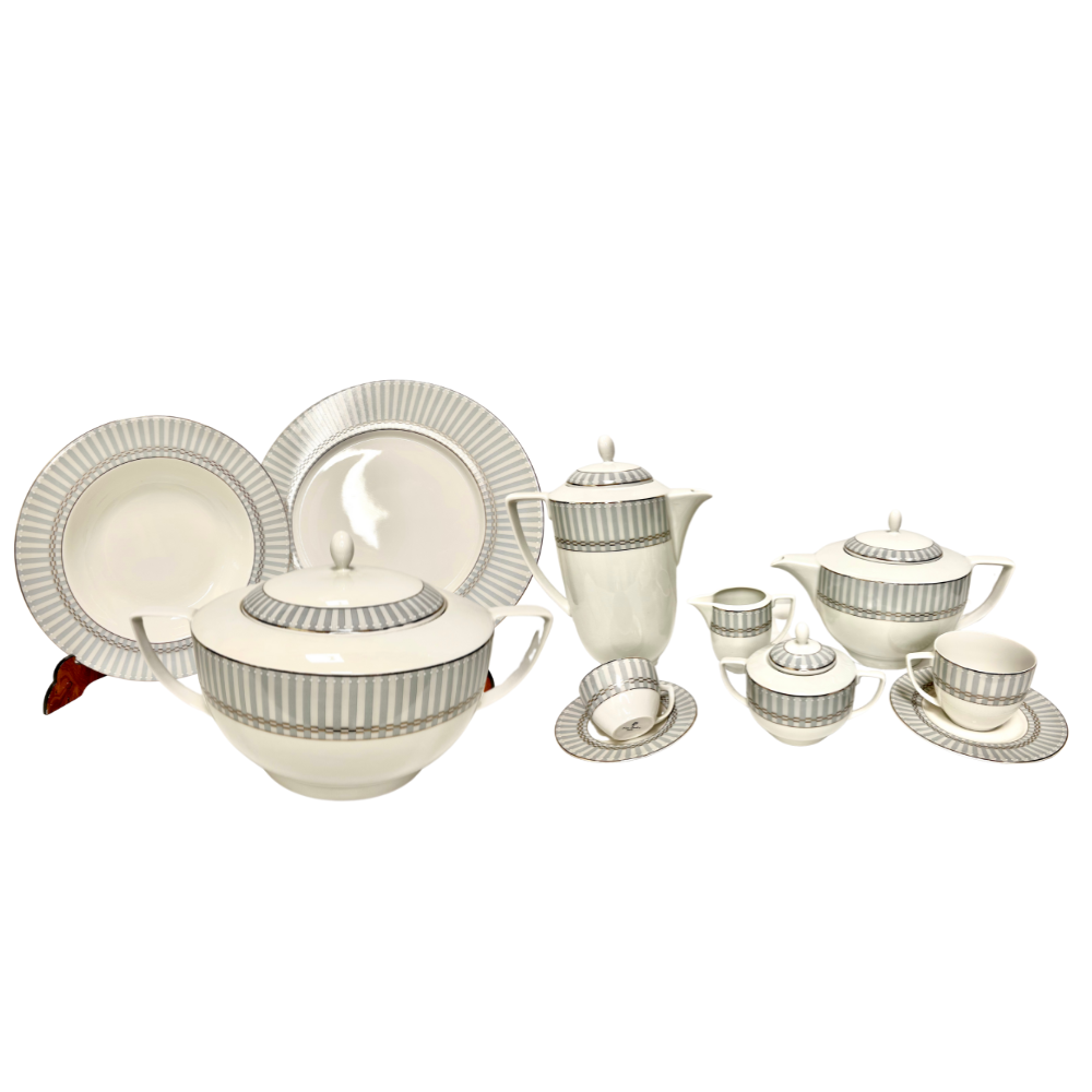 Servizio completo piatti,caffè e tè Pierre Cardin Paris filo argento e ciano - rif. 9322 è un'opera d'arte per la tua tavola. Questo set completo comprende un totale di 95 pezzi, suddivisi come segue: